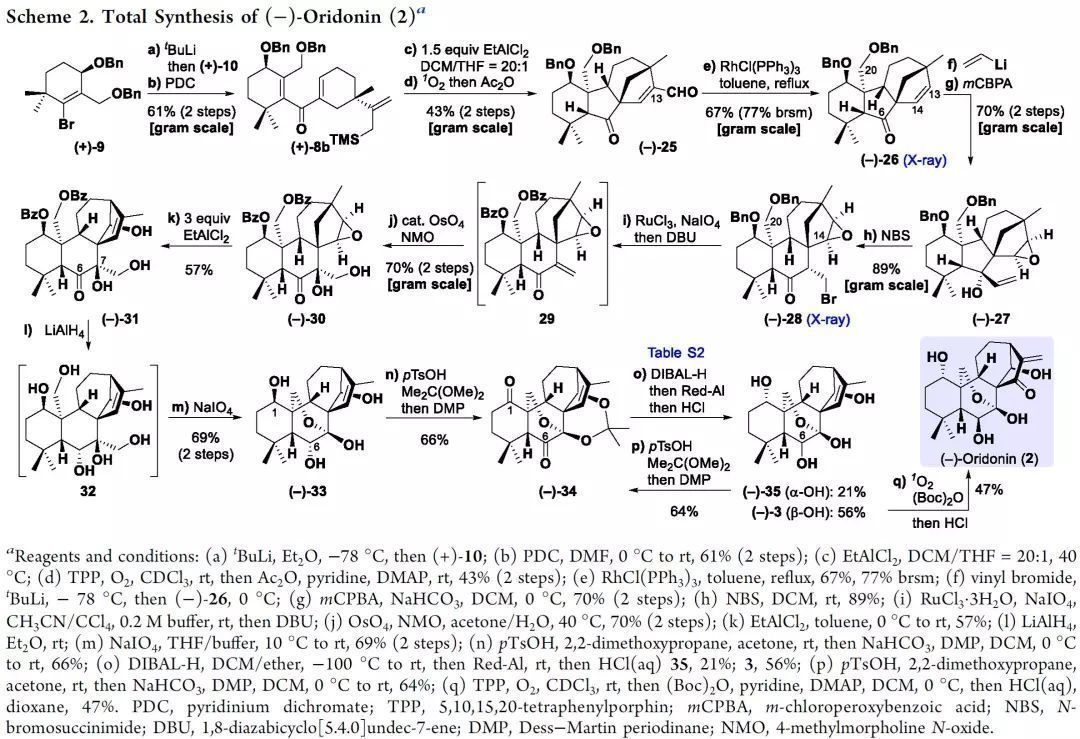 中間體33經丙酮類似物保護,隨后進行Dess-Martin氧化,一鍋法以66%的收率形成酮34。通過仔細優化還原/脫保護順序和反應條件,作者首先用DIBAL-H在-100 °C下于DCM/乙醚(3:1)中區域和非對映選擇性還原C1酮,然后用Red-Al還原C6羰基,從而在原位脫保護后分別以21%和56%的收率得到非對映異構體(-)-35和(-)-3。3進行單線態氧烯反應,然后經TCCA處理,可以形成烯酮片段,但僅能以較低的收率得到(?)-oridonin(2),最終,作者發現(Boc)2O能有效地將衍生自(-)-3的烯丙基氫過氧化物轉化為烯酮,同時保護C14羥基。因此,隨著HCl的加入,該一鍋法反應能以47%的收率得到天然產物2。