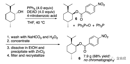 Mitsunobu反應在有機合成中應用比較多,可以將伯醇或仲醇轉換酯,苯醚,硫醚,胺等化合物。例如L-薄荷醇和4-硝基苯甲酸,在TPP和DEAD的條件下發生Mitsunobu反應得到化合物(6),后處理過程經碳酸鈉和過氧化物洗滌,移除剩余的4-硝基苯甲酸,并將過量的TPP轉化為TPPO,用乙醇/ZnCl2體系沉淀TPPO,可以有效的將其去除。