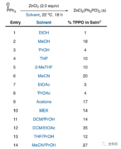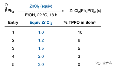 當然小規模的樣品純化可以通過柱層析容易的去除三苯基氧膦,但對于放大反應,柱層析純化的使用則會受到很大的限制,除了采用重結晶的方法,利用ZnCl2與TPPO形成共晶沉淀的策略,去除三苯基氧膦副產物是一種實用的簡便方法。