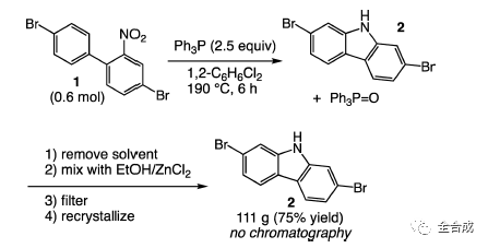 由4,4′-二溴-2-硝基聯苯(1),經三苯基膦還原環合得到咔唑(2)的反應中,后處理過程首先將反應溶劑濃縮去除,再加入乙醇和ZnCl2,有效的將副產物三苯基氧膦轉化為ZnCl2(TPPO)2沉淀,方便的通過過濾移除TPPO。