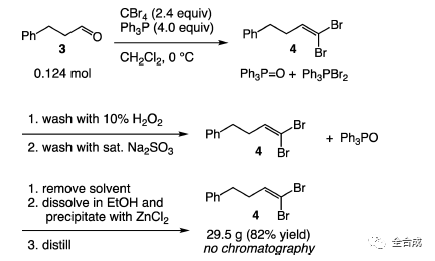 Corey-Fuchs反應是一個經典的由醛制備炔烴的重要方法,反應的第一個階段是醛,三苯基膦和四溴化碳反應形成二溴代烯烴,主要的副產物是三苯基氧膦。例如在合成化合物(4)過程中,監控反應結束后,用雙氧水處理反應液,將剩余的三苯基膦轉化為TPPO,再用ZnCl2沉淀將其去除,無需柱層析純化步驟。
