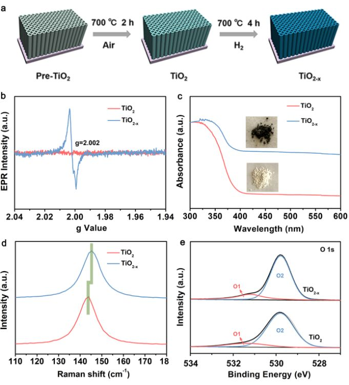 我們利用氫氣高溫還原 TiO2 納米管,制備出富氧空位的 TiO2-x,再借助 EPR、UV-vis-NIR DRS、Raman 和 XPS 等表征手段證實(shí)了 TiO2 中氧空位的引入,詳見(jiàn)圖2。▲Figure 2. (a) Schematic illustration for TiO2-x synthesis. (b) EPR spectra, (c) UV-Vis absorption spectra (the insets are optical photographs), (d) Raman spectra and (e) XPS spectra of TiO2 and TiO2-x nanotubes.