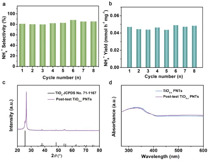 D: TiO2-X 電催化硝酸根還原穩(wěn)定性圖我們測(cè)試了連續(xù)循環(huán)實(shí)驗(yàn)后氨的選擇性和產(chǎn)率,結(jié)果表明經(jīng)過(guò) 16 小時(shí)測(cè)試后其性能依然穩(wěn)定。我們進(jìn)一步表征了電化學(xué)測(cè)試后的 TiO2-X,通過(guò) XRD、UV-vis-NIR DRS 結(jié)果表明 TiO2-X 材料在電化學(xué)測(cè)試后依舊穩(wěn)定,詳見(jiàn)圖4。 ▲Figure 4. (a) Selectivity and (b) yield rate of ammonium after consecutive recycling test. (c) XRD pattern of post-test TiO2-x. (d) UV-Vis absorption spectra of TiO2-x and post-test TiO2-x.