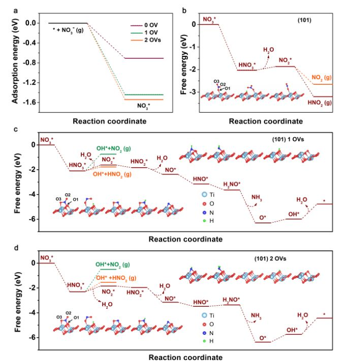 我們計(jì)算了含 0、1、2 個(gè)氧空位的 TiO2(101)表面對(duì)硝酸根離子吸附能以及硝酸鹽還原反應(yīng)的自由能變化。結(jié)果表明,氧空位可以“捕獲”硝酸鹽中的氧以增強(qiáng)對(duì)硝酸根的吸附,削弱 N-O鍵。同時(shí),氧空位的引入還可以調(diào)節(jié)中間體與催化劑的相互作用,從而優(yōu)化反應(yīng)路徑并阻礙副產(chǎn)物的形成,進(jìn)而提高選擇性,詳見(jiàn)圖6。 ▲Figure 6. (a) Calculated adsorption energies of nitrate ion on TiO2 (101) surfaces with zero, one and two OVs. Calculated free energy changes of nitrate reduction reaction on TiO2 (101) surface with (b) zero, (c) one and (d) two oxygen vacancies in one 1×3 slab at 0 V vs. RHE.