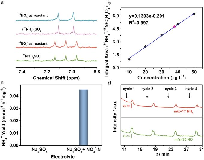 E: 15N 同位素標(biāo)記實(shí)驗(yàn)的核磁定量以及原位電化學(xué)質(zhì)譜檢測(cè)。為了對(duì)產(chǎn)物 NH4+ 進(jìn)行嚴(yán)格定量,以排除由于催化劑自身和環(huán)境污染帶來(lái)的誤差,我們將被 15N 同位素標(biāo)記和未標(biāo)記的 NO3- 作為氮源進(jìn)行了電化學(xué)測(cè)試,所得產(chǎn)物通過(guò)核磁氫譜進(jìn)行定量。同時(shí),在未引入氮源(NO3-)的空白電解液中進(jìn)行測(cè)試,結(jié)果表明只產(chǎn)生了極少量的 NH4+。綜上結(jié)果說(shuō)明,產(chǎn)物 NH4+ 是源于反應(yīng)物 NO3- 的,從而可以排除其他污染因素的干擾。此外,通過(guò)原位電化學(xué)質(zhì)譜測(cè)試,我們捕獲到了中間產(chǎn)物 NO,為接下來(lái)反應(yīng)路徑的推導(dǎo)提供了實(shí)驗(yàn)依據(jù)。▲Figure 5. (a) 1H NMR spectra (600 MHz) of standard samples ((15NH4)2SO4 and (14NH4)2SO4)) and electrolyte after the NO3- reduction at -1.6 V for 2h using 14NO3- and 15NO3- as N-source. (b) The standard curve of integral area (15NH4+-15N / C4H4O4) against 15NH4+-15N concentration. (c) Ammonium yield rate over TiO2-x in Na2SO4 electrolyte with and without nitrate. (d) DEMS measurements of TiO2-x for nitrate electroreduction.