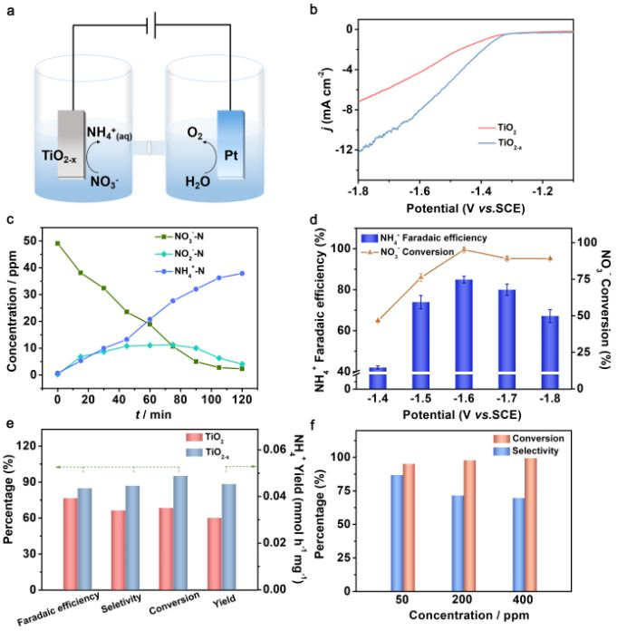 我們測(cè)試了 TiO2-X 電催化還原硝酸根的實(shí)際效果。分析了硝酸鹽還原過(guò)程中的 LSV 曲線,以及在 -1.6 V vs. SCE 時(shí),NO3-、NO2- 和 NH4+ 的濃度隨時(shí)間的變化規(guī)律,得到銨的法拉第效率、選擇性、產(chǎn)率和硝酸鹽轉(zhuǎn)化率。系統(tǒng)地證實(shí)了氧空位引入可以顯著提升 TiO2 電催化硝酸根合成氨能力,詳見(jiàn)圖3。▲Figure 3. (a) Schematic illustration of electrocatalytic nitrate reduction. (b) LSV curves of TiO2-x and TiO2 during the nitrate reduction process. (c) Time-dependent concentration of NO3-, NO2- and ammonium over TiO2-x at -1.6 V. (d) Faradaic efficiency of ammonium and nitrate conversion rate over TiO2-x at given potentials. (e) The comparisons of ammonium Faradaic efficiency, selectivity, yield and nitrate conversion rate between TiO2-x and TiO2. (f) Conversion of nitrate and selectivity of ammonium for nitrate electroreduction with different nitrate-N concentration.