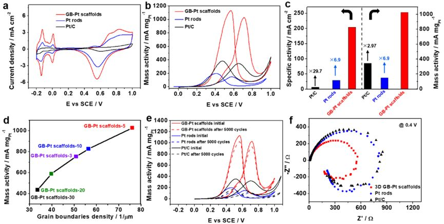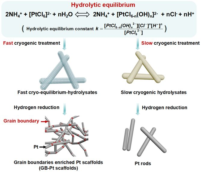 近期,北京航空航天大學楊樹斌團隊通過氫氣還原水解平衡產物,得到了一系列的富含大量晶界的三維貴金屬催化劑,這種簡單的合成方法可以擴展到制備多種富含晶界的金屬催化劑中,在催化和傳感器領域有廣泛的應用前景。相關研究以"Fast Cryomediated Dynamic Equilibrium Hydrolysates towards Grain Boundary-Enriched Platinum Scaffolds for Efficient Methanol Oxidation"為題,發表在Research上。
