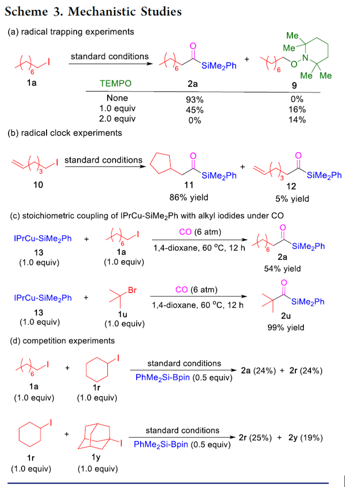 本文作者:杉杉 導(dǎo)讀 近日,伊利諾伊大學(xué)Mankad Neal教授課題組在JACS發(fā)表論文,報道了Cu催化下,實現(xiàn)未活化烷基鹵化物的羰基硅烷化反應(yīng),高效地合成了烷基取代的酰基硅烷衍生物。在溫和的反應(yīng)條件下可以耐受多種官能團(tuán),伯、仲和叔烷基鹵化物均可適用。此外,該方法不僅合成不同甲硅烷基的酰基硅烷衍生物,同時可將產(chǎn)物還原為相應(yīng)的α-羥基硅烷衍生物。機理研究表明,甲硅烷基銅中間體通過單電子轉(zhuǎn)移活化烷基鹵,形成烷基自由基中間體,進(jìn)而進(jìn)行羰基硅烷化反應(yīng)。 "Cu-Catalyzed Carbonylative Silylation of Alkyl Halides: Efficient Access to Acylsilanes Li-Jie Cheng, Neal P. Mankad* J. Am. Chem. Soc. 2020, 142, 1, 80-84. DOI:10.1021/jacs.9b12043" 正文 有機硅烷化合物廣泛應(yīng)用于有機合成和材料科學(xué)中,含有酰基硅烷的結(jié)構(gòu)單元作為典型代表,Brook重排是制備此類骨架的常用方法。然而,大多數(shù)已報道文獻(xiàn)中存在一些不足,如需多步制備、底物范圍窄等。Brook和Corey報道的經(jīng)典合成路線中,從醛類底物中合成酰基硅烷衍生物,但需要繁瑣的保護(hù)/脫保護(hù)過程(Scheme 1a)。盡管可將含有陰離子甲硅烷親核試劑直接加成到羧酸衍生物中(一步合成酰基硅烷衍生物),但通常需要化學(xué)計量的甲硅烷基銅試劑或甲硅烷基鋰試劑(這類試劑會限制官能團(tuán)的兼容性)。已報道文獻(xiàn)中,鈀催化下,可實現(xiàn)酰氯與乙硅烷或甲硅烷基錫試劑的甲硅烷基化反應(yīng),合成酰基硅烷衍生物。此外,Riant通過使用甲硅烷基硼烷試劑,在銅催化下,實現(xiàn)酸酐甲硅烷基化反應(yīng),獲得苯甲酰基硅烷衍生物(Scheme 1b)。盡管這些方法可以在溫和條件下簡單地合成酰基硅烷衍生物,但由于底物對水分敏感(如酰氯或酸酐),從而限制了它們的應(yīng)用范圍。為了克服這類問題,羰基化制備酰基硅烷作為一種高效的方法(可將羰基直接引入簡單的前體中)。早期,Seyferth和Weinstein報道了通過有機鋰化合物在-110℃時進(jìn)行羰基化反應(yīng),從而獲得酰基硅烷衍生物。此后,Beller報道了更為實用的鈀催化體系,通過芳基碘化物的羰基硅烷化反應(yīng),獲得苯甲酰基硅烷(Scheme 1c)。但是,烷基鹵化物底物尚未研究,可能是由于烷基親電試劑在羰基化反應(yīng)中,氧化加成速度非常慢,并且存在β-消除的競爭關(guān)系。 基于前期報道工作總結(jié)(銅催化炔烴與鹵代烷的羰基化C-C偶聯(lián)反應(yīng)和未活化烷基鹵的還原羰基化反應(yīng)),作者發(fā)現(xiàn)在此類反應(yīng)中,通常由烷基鹵生成酰基后再與各種有機銅親核試劑偶聯(lián),得到相應(yīng)的羰基類化合物。作者假設(shè),通過銅催化劑和甲硅烷基硼烷反應(yīng)生成親核甲硅烷基銅,是否可與鹵代烷反應(yīng)制備酰基硅烷衍生物(Scheme 1d)。在本文中,作者通過銅催化的羰基硅烷化過程,從烷基鹵化物直接催化合成烷基取代的酰基硅烷衍生物。 首先,作者以1-碘辛烷1a與PhMe2Si-Bpin作為模型底物,在含有CO(6 atm)下反應(yīng),經(jīng)過大量的條件篩選發(fā)現(xiàn)(Table 1),當(dāng)使用IPrCuCl作為催化劑,以NaOPh作為堿,以二氧六環(huán)作為溶劑時,可獲得93%收率的酰基硅烷2a(entry 1)。當(dāng)不加入銅催化劑時,則不發(fā)生反應(yīng)(entry 2)。而對NHC配體篩選中(entries 3-6),使用ClIPr配體時收率略低,而使用SIPr和MeIPr配體時收率大幅下降。有趣的是,使用空間位阻較小的IMes配體時,沒有目標(biāo)產(chǎn)物,但獲得較高收率烷基硅烷3a。如果將底物1a的碘取代改為溴或氯時,導(dǎo)致更差的反應(yīng)結(jié)果(entries 7-8)。而對堿的篩選中(entries 9-11),NaOMe、NaOtBu、LiOMe均沒有獲得較好的結(jié)果。而將PhMe2Si-Bpin的量減少至1.2倍當(dāng)量或?qū)aOPh降至2.0倍當(dāng)量時,產(chǎn)率都略有降低(entries 12-13)。而對溶劑的篩選中(entries 14-15),二氧六環(huán)作為最佳溶劑。如果將反應(yīng)在室溫下進(jìn)行,則導(dǎo)致大量烷基硅烷副產(chǎn)物(entry 16)。值得注意的是,如果將反應(yīng)在3 atm或1 atm大氣CO壓力下也可獲得所需產(chǎn)物,但收率略有降低(entries 17-18)。 在獲得上述最佳反應(yīng)條件后,作者開始對底物進(jìn)行了擴展(Table 2)。反應(yīng)結(jié)果表明,烷基碘化物末端含有苯基(2b)、芐基醚(2c)、氯烷基(2d)、末端烯烴(2n)等,均獲得較好的結(jié)果。而含有雜環(huán)的底物也能夠與體系兼容,如呋喃(2e)、噻吩(2f)、吲哚基(2g)等。末端苯基(2h–2l)含有三氟甲基、酯基、氰基、氯基、溴基取代時,也可獲相應(yīng)的目標(biāo)產(chǎn)物,但碘取代的底物(2m)存在一定的副反應(yīng)。隨后,作者將伯烷基碘擴大到仲烷基碘,底物仲烷基碘(2o–2r)不受位阻影響,同時環(huán)烷基碘(2s、2t)也與體系兼容。隨后,叔烷基親電體(2u–2y)也獲得了令人滿意的結(jié)果,同時具有更高的收率。 為了驗證該方法的適用性,作者進(jìn)行了如下實驗(Scheme 2)。首先,克級實驗同樣以高收率獲得了預(yù)期的酰基硅烷產(chǎn)物2a(Scheme 2a)。此外,該方案可對天然產(chǎn)物或藥物進(jìn)行后期的修飾。如雌酮衍生物4,在上述標(biāo)準(zhǔn)條件下,以優(yōu)異的產(chǎn)率獲得酰基硅烷5(Scheme 2b)。此外,除了PhMe2Si-Bpin作為甲硅烷基來源外,活性較低的Et3Si-Bpin(高溫下)也可作為偶聯(lián)底物(Scheme 2c)。如果在反應(yīng)完成之