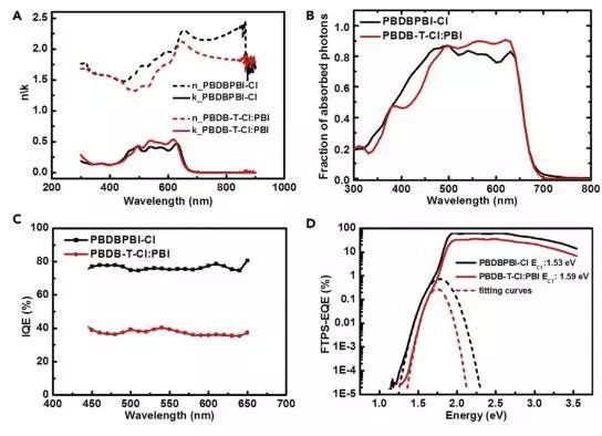 (A) PBDBPBI-Cl and PBDB-T-Cl:PBI在不同波長下的折射系數和消光值(nk值);