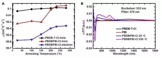 (B) PBDB-T-Cl,PBI,PBDBPI-Cl(25℃)和PBDBPBI-Cl(230℃退火)的PIA譜。
