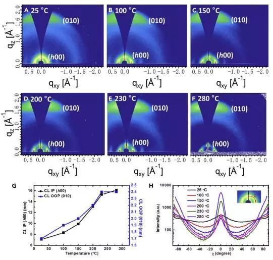 (A-F) PBDBPBI-Cl薄膜在不同退火溫度下的GIWAXS圖譜;