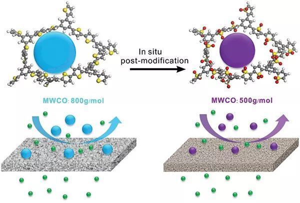 近日,國家納米科學中心唐智勇研究員、李連山研究員與天津大學盧小泉教授合作,報道了含有噻吩的共軛微孔聚合物(TTB-CMP)膜,其具有高溶劑滲透性和可調孔徑。研究表明,與僅含有惰性C-C和C-H鍵的共軛微孔聚合物不同,TTB-CMP膜中噻吩單元的存在使得通過后修飾實現精細孔徑調節成為可能,因此,膜的截留分子量可以有效地調節而滲透性沒有顯著的衰減。該成果以題為" Controlling the Selectivity of Conjugated Microporous Polymer Membrane for Efficient Organic Solvent Nanofiltration"發表在國際著名期刊Adv. Funct. Mater上。
