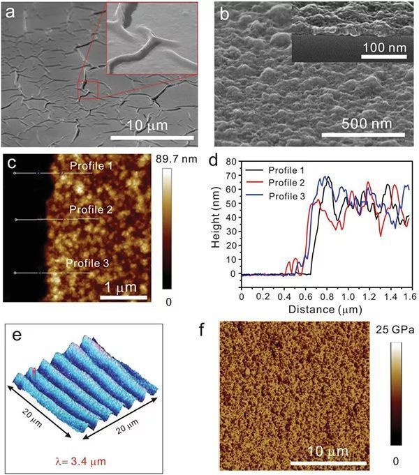 (a) 具有皺紋表面的大面積膜的SEM圖像; (b) 表面放大后膜的SEM圖像及其橫截面(插圖); (c) TTB-CMP 膜的AFM圖像; (d) TTB-CMP 膜的高度輪廓; (e) 形成皺紋的AFM圖像; (f) 通過PFQNM方法測試TTB-CMP的楊氏模量。