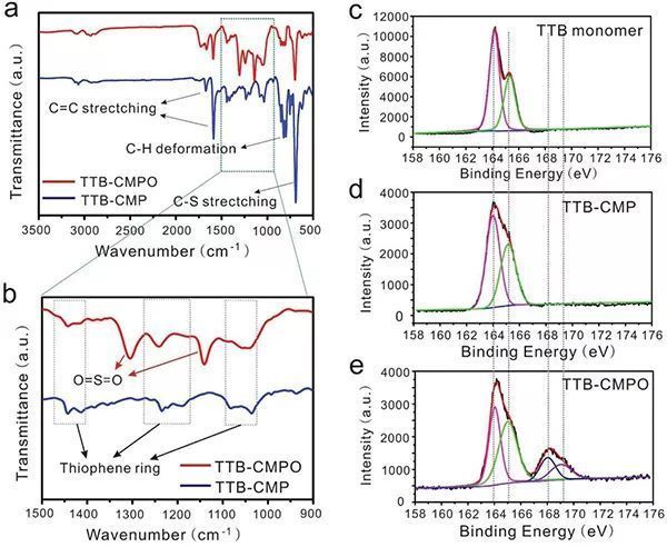 (a, b) TTB-CMP膜(藍線)和TTB-CMPO膜(紅線)的FT-IR光譜; (c) TTB單體的XPS光譜; (d) TTB-CMP膜的XPS光譜; (e) TTB-CMPO膜的XPS光譜。