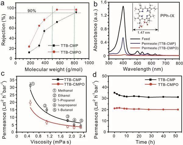 (a) TTB-CMP(黑線)和TTB-CMPO(紅線)膜的截留行為與乙醇中染料的分子量的關系; (b) PPh-IX在乙醇中的紫外-可見光譜; (c) 溶劑滲透率與溶劑粘度的關系圖; (d) TTB-CMP(黑線)和TTB-CMPO(紅線)膜的隨時間變化的甲醇滲透圖。