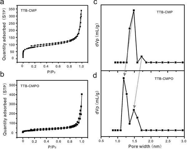 (a) TTB-CMP在77K下收集N2吸附等溫線; (b) TTB-CMPO在77K下收集N2吸附等溫線; (c) TTB-CMP的孔徑分布; (d) TTB-CMPO的孔徑分布。
