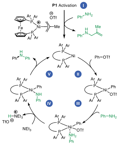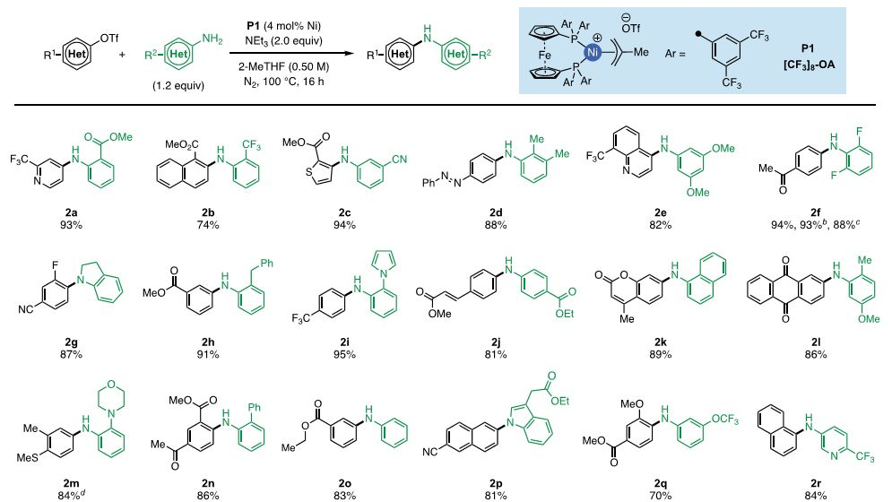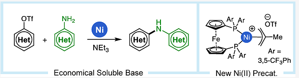 在鈀催化的胺化反應(yīng)中,使用可溶解的有機堿可以解決眾多非均相體系引起的問題。比如,使用有機堿可以兼容對無機堿和親核試劑敏感的官能團。均相催化的C-N偶聯(lián)反應(yīng)目前尚無使用三烷基胺的例子,鎳催化相比于鈀催化還是存在著一些優(yōu)勢的。然而到目前為止,使用三乙胺做堿,鎳催化的C-N偶聯(lián)尚無報道。2月19號,來自麻省理工的Stephen L. Buchwald團隊在JACS發(fā)文報道了使用經(jīng)濟性三乙胺做堿,空氣中穩(wěn)定的易制備的鎳催化劑催化的C-N偶聯(lián)反應(yīng),可以高效實現(xiàn)對眾多無機堿敏感官能團敏感底物的偶聯(lián)反應(yīng)。