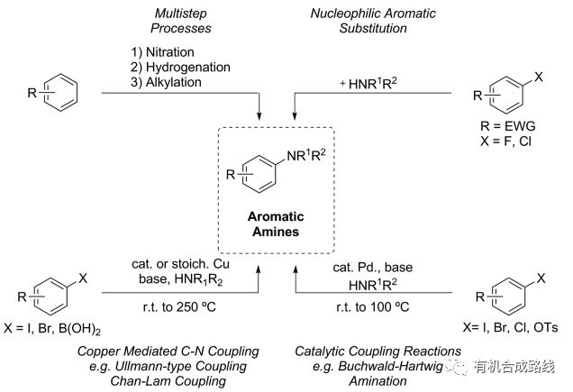 芳胺是化學中的基礎產物和合成砌塊,在藥物化學和農藥學中顯得尤為重要。傳統的合成方法是經歷硝化,還原,活化芳烴底物的親核取代步驟,或銅催化的芳胺與芳烴鹵代物的Ullmann反應。這些方法的缺點非常明顯,包括有限的底物范圍和較差的官能團兼容性。銅催化的Ullmann需要當量級別的銅催化劑,往往需要很高的溫度。最近幾年發展的Chan-Lam反應以及來自中科院上海有機所的馬大為研究員在降低催化劑用量和降低反應溫度等方面做出了突出的貢獻。鈀催化的Buchwald-Hartwig偶聯極大地改變了這一方向,目前已經成為構建C-N鍵的基礎方法。