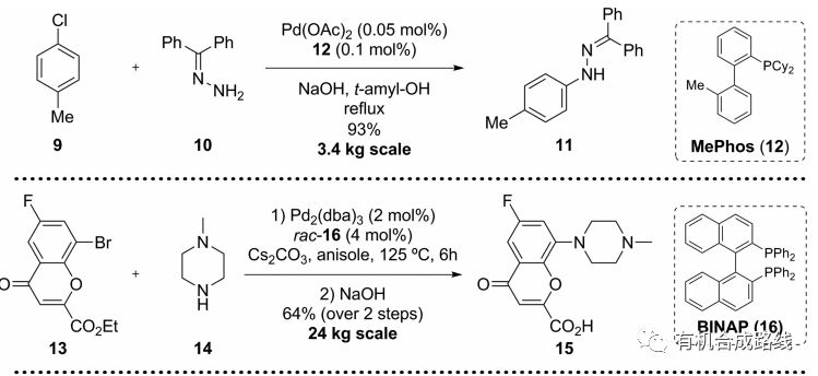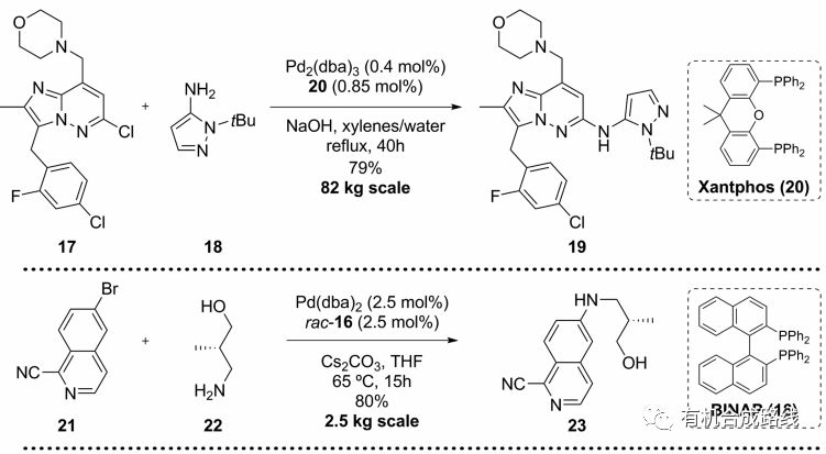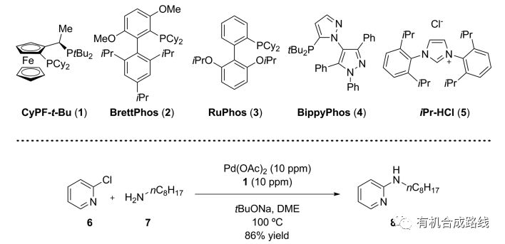 經過二十幾年的發展,該類反應的機理研究的已經比較透徹,并出現了一些標準的反應配體,如Hartwig發展的CyPF-t-Bu 配體,Buchwald發展的BrettPhos和RuPhos配體,目前這兩個配體也被認為是高效的配體,當然也是商品化的試劑。除此之外,BippyPhos和氮雜環卡賓iPrHCl配體使用也非常廣泛,并且也可以直接買到。目前該類反應的底物已經可以做的很廣,并且催化劑用量可以降到百萬分之幾的級別。