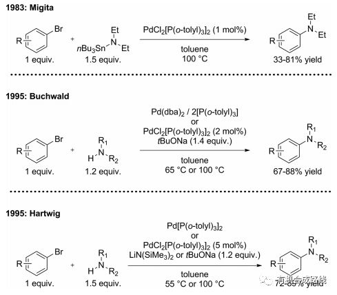 這個反應最早可以追溯到1983年,Migita報道的鈀催化芳基溴代物與錫酰胺的偶聯反應。1994年,兩個獨立的報道出現,Hartwig團隊研究了該反應的中間體和催化物種,Buchwald團隊報道了避免分離錫酰胺的改進方法。一年后,也就是1995年,兩個團隊獨立報道了可以被稱為現在C-N鍵構建反應典型的鈀催化,大位阻鍵參與的偶聯反應,開創了先河。