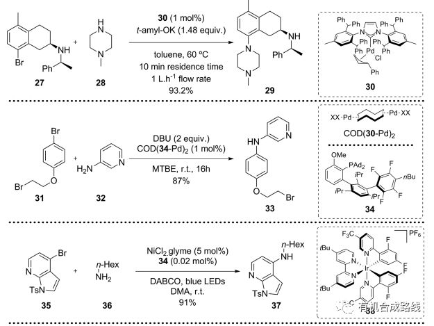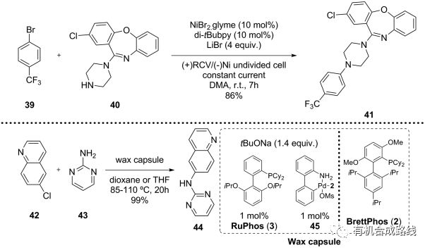 盡管該方法已經成熟地被用于構建各種C-N鍵,對它的效率和底物范圍的改進從未停止過。AstraZeneca報道了非常有意思的流體反應器,可連續進行生產。最近 Buchwald團隊報道使用DBU做鍵,在室溫下進行高效的偶聯反應。同時,隨著光化學的不斷發展,科學家們將該技術與鈀催化偶聯相結合,也可允許反應在室溫下高效進行。此外,電化學與膠囊技術也被用于該反應,均取得了不錯的結果。總之發展還在繼續。