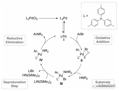 目前該類反應的機理使用的是Hartwig早期建議的機理,也是目前公認的反應機理,氧化加成,底物配位,脫質子和還原消除步驟。