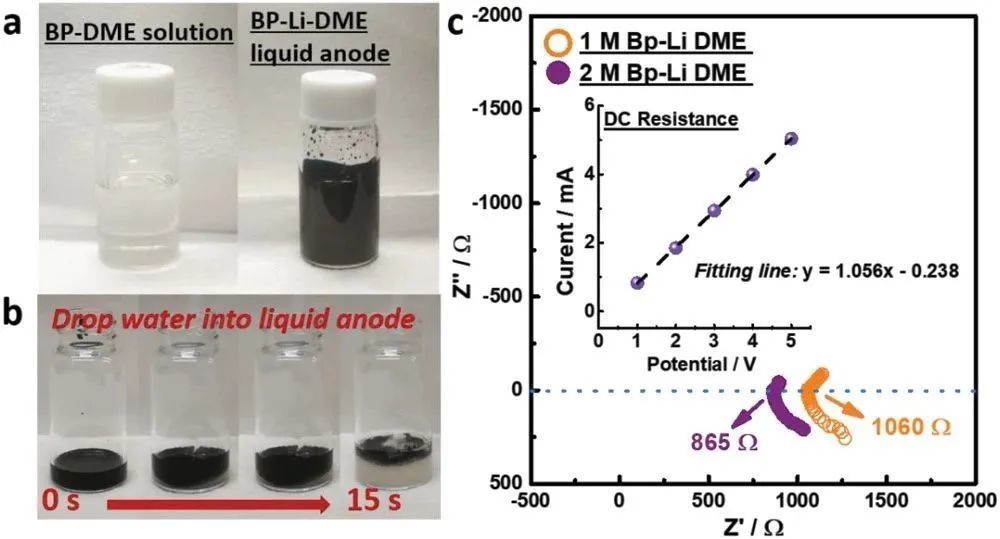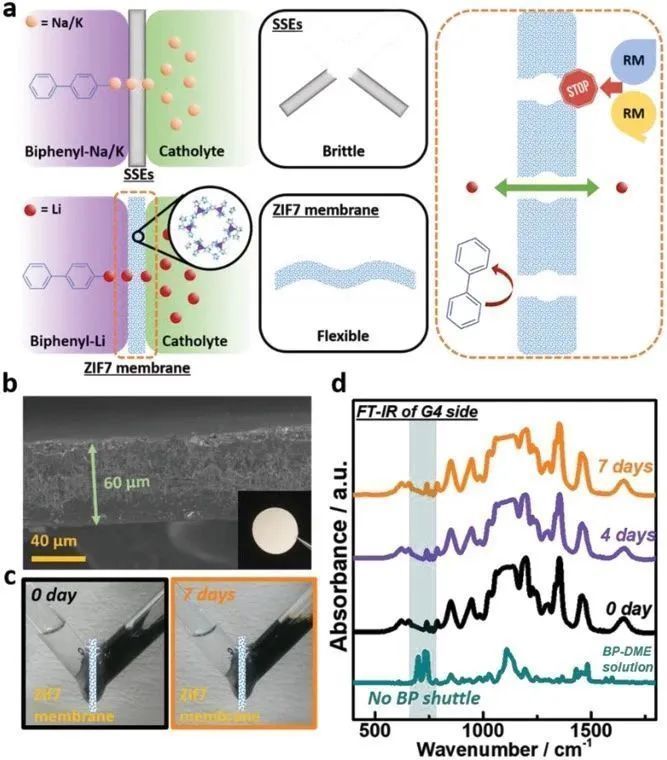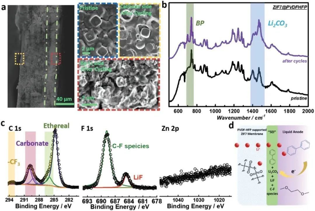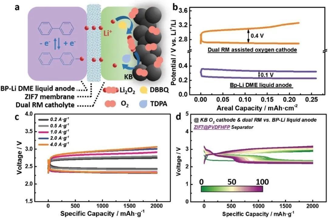 大型電動(dòng)設(shè)備的開(kāi)發(fā)迫切需要提高安全可充電電池能量密度和功率密度。鋰空(Li-O2)電池因?yàn)檩^高的理論能量密度而脫穎而出。但是,鋰金屬的高反應(yīng)性和大體積變化總是導(dǎo)致鋰?yán)寐实汀T赟EI層中電流密度的不均勻分布導(dǎo)致了鋰枝晶生長(zhǎng),從而導(dǎo)致電池短路甚至嚴(yán)重事故。在正極側(cè),基于Li2O2可逆形成和分解的理想電化學(xué)反應(yīng)始終受到Li2O2和碳陰極之間的固-固接觸的挑戰(zhàn),這導(dǎo)致反應(yīng)動(dòng)力學(xué)變慢,并導(dǎo)致鋰電池產(chǎn)生高的過(guò)電勢(shì)和差的循環(huán)性能。因此,迫切需要尋找Li-O2電池中Li金屬的替代負(fù)極。堿性有機(jī)溶液是有希望的液態(tài)負(fù)極材料,但缺乏有關(guān)其在鋰電池中應(yīng)用的報(bào)道。近年來(lái),基于金屬有機(jī)框架(MOF)的電極因其3D框架結(jié)構(gòu)能夠促進(jìn)鋰離子的傳輸而備受關(guān)注。 成果簡(jiǎn)介 南京大學(xué)周豪慎(通訊作者)等研究了具有液態(tài)鋰基負(fù)極和MOF隔膜的安全有機(jī)氧電池,發(fā)現(xiàn)該電池具有優(yōu)異的倍率性能,長(zhǎng)的循環(huán)壽命以及好的耐用性。相關(guān)成果以“A Safe Organic Oxygen Battery Built with Li-Based Liquid Anode and MOFs Separator”為題發(fā)表在Advanced Energy Materials上 研究亮點(diǎn) 1. 構(gòu)建了一種具有液態(tài)鋰基負(fù)極、MOF隔膜和氧正極組成的有機(jī)氧電池; 2. MOFs基隔膜可以隔離液體負(fù)極并將氧化還原介質(zhì)限制在正極電解液中避免穿梭效應(yīng); 3. 有機(jī)氧電池具有優(yōu)異的倍率性能,長(zhǎng)的循環(huán)壽命以及良好的耐用性。 圖文導(dǎo)讀 圖1. Bp-Li液態(tài)負(fù)極的性能:a)制備的Bp-Li液態(tài)負(fù)極;b)Bp-Li負(fù)極與水的反應(yīng);c)通過(guò)EIS方法測(cè)量Bp-Li液態(tài)負(fù)極的電導(dǎo)率;插圖:通過(guò)直流方法測(cè)得的電壓-電流曲線。 通過(guò)在1,2-二甲氧基乙烷聯(lián)苯中溶解等摩爾比的鋰金屬來(lái)制備有機(jī)液態(tài)Li基負(fù)極。鋰金屬溶解后,溶液變成深藍(lán)色(圖1a)。這表明電子從鋰原子轉(zhuǎn)移到聯(lián)苯分子,并形成聯(lián)苯-鋰絡(luò)合物(Bp-Li)。通過(guò)將H2O滴入Bp-Li負(fù)極來(lái)研究其反應(yīng)性(圖1b),反應(yīng)過(guò)程比較溫和,沒(méi)有明顯的爆炸和氣泡產(chǎn)生,這使Bp-Li負(fù)極成為有希望的鋰基負(fù)極的安全候選者。本工作分別測(cè)量了1 M和2 M Li濃度的Bp-Li負(fù)極的電導(dǎo)率。圖1c顯示了每種溶液的電化學(xué)阻抗譜(EIS),從1 M到2 M Li濃度,溶液電阻從1060 Ω降至865 Ω。1 M Bp-Li的總電導(dǎo)率為1.11×10-2 S cm-1,2 M Bp-Li的總電導(dǎo)率為1.36×10-2 S cm-1。通過(guò)直流方法進(jìn)一步測(cè)量2 M Bp-Li負(fù)極的電導(dǎo)率。在電壓-電流曲線中(圖1c插圖),2 M Bp-Li負(fù)極的電導(dǎo)率為1.24×10-2 S cm-1, 這個(gè)值接近于DME中聯(lián)苯-Na絡(luò)合物的電導(dǎo)率。這再次證明了Bp-Li負(fù)極的高電導(dǎo)率,有望成為液態(tài)鋰基負(fù)極的候選材料。 圖2. a)基于固態(tài)電解質(zhì)(SSEs)的聯(lián)苯-Na / K液體負(fù)極與ZIF7隔膜的聯(lián)苯-Li液體負(fù)極的示意圖;b)ZIF7膜的橫截面SEM圖像,插圖:ZIF7膜的圖片;c)滲透裝置在開(kāi)始時(shí)(黑色)和在7天后(橙色)的圖片;d)在不同時(shí)間從G4側(cè)提取的電解質(zhì)的FT-IR光譜。 圖2a顯示了MOFs基隔膜,一種沸石咪唑酯骨架(ZIF7)具有良好的熱穩(wěn)定性和化學(xué)穩(wěn)定性。通過(guò)將ZIF7粉末和聚合物粘合劑的混合物澆鑄到基底上干燥后將其剝離制備了ZIF7膜。如圖2b所示,所制備的ZIF7膜顯示均勻的米色,表明ZIF7顆粒均勻分布在膜中。通過(guò)滲透測(cè)試對(duì)ZIF7膜分離Bp-Li負(fù)極的能力進(jìn)行了研究。圖2c顯示了剛開(kāi)始和7天后的滲透測(cè)試的圖片。在7天內(nèi),正極側(cè)沒(méi)有明顯的顏色變化,表明ZIF7膜可有效阻止Bp-Li傳輸?shù)秸龢O側(cè)。FT-IR進(jìn)一步研究了測(cè)試過(guò)程中可能存在的物質(zhì)(圖2d),在650–750 cm-1的范圍內(nèi),聯(lián)苯分子由于芳香族面外C-H彎曲振動(dòng)而顯示兩個(gè)特征峰。 圖3. a)由Bp-Li液態(tài)負(fù)極,雙RM輔助KB正極和ZIF7隔膜組成的有機(jī)O2電池的示意圖;b)雙RM輔助氧正極和Bp-Li液體負(fù)極半電池的電化學(xué)特性;c)鋰基有機(jī)O2電池的倍率性能和d)在100圈循環(huán)內(nèi)的循環(huán)性能。 圖3a顯示了一種由Bp-Li液態(tài)負(fù)極,雙RM輔助KB正極和ZIF7隔膜組成的有機(jī)O2電池。圖3b顯示了雙RMs輔助KB基氧正極和Bp-Li液態(tài)負(fù)極半電池的電化學(xué)性能。氧正極的過(guò)電勢(shì)已降低至約0.4 V,這表明DBBQ和TDPA協(xié)同氧化還原介導(dǎo)的作用。Bp-Li負(fù)極(相對(duì)于Li+/ Li)具有0.3 V的低工作電壓和0.1 V的窄電壓間隙,這歸因?yàn)锽p-Li負(fù)極的高離子電導(dǎo)率。圖3c顯示了不同倍率下基于Bp-Li負(fù)極的有機(jī)O2電池的電化學(xué)性能。在低電流密度下,有機(jī)O2電池在~2.45 V時(shí)表現(xiàn)出平穩(wěn)的放電平臺(tái),在~2.75V時(shí)表現(xiàn)出平穩(wěn)的充電平臺(tái)。如圖3d所示,具有Bp-Li負(fù)極的有機(jī)O2電池在4000 mA g-1的高電流密度和2000 mAh g-1的高可逆比容量下可以實(shí)現(xiàn)100圈循環(huán)。良好的電化學(xué)性能表明,Bp-Li液態(tài)負(fù)極與ZIF7隔