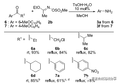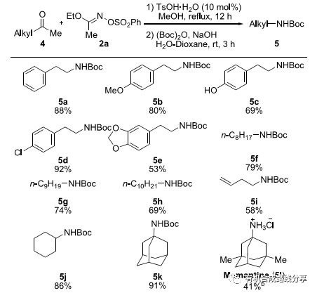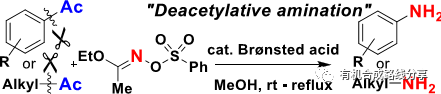 最近,來自日本的化學家Kengo Hyodo團隊于美國化學會頂級期刊Org. Lett.(10.1021/acs.orglett.9b00807)報道了芳乙酰基類化合物在Bronsted酸作用下的脫乙酰基胺化反應,反應非常高效,不僅適用于芳香族的芳乙酰基類化合物,也可適用于脂肪族類化合物(圖2)。