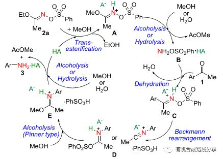 接下來我們來看一下反應機理,首先是化合物2a在甲醇的作用下進行轉酯化作用,其接著進行水解反應得到B,B與芳基乙酰基1進行反應得到絡合物C,其接著進行重排反應得到絡合物D,其再進行水解反應得到胺類化合物(圖8)。