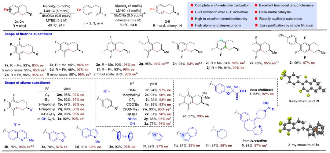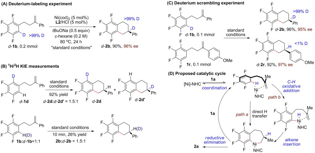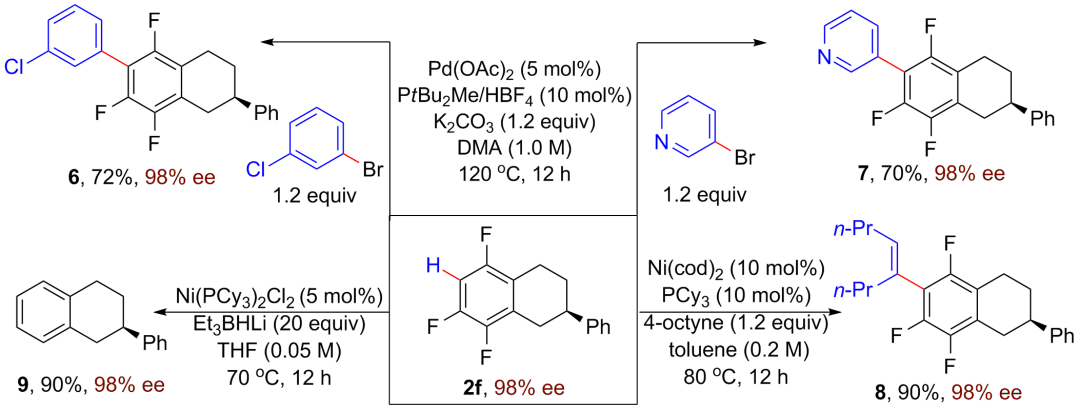 前沿科研成果 氮雜環(huán)卡賓-鎳催化的多氟芳烴的不對(duì)稱C-H烷基化反應(yīng) 圖2. 手性多氟四氫萘類化合物的合成及其挑戰(zhàn) (來源:Angew. Chem. Int. Ed.) 手性多氟四氫萘類化合物是四氫萘和多種雜環(huán)化合物的生物等排體,廣泛存在于各類藥物分子結(jié)構(gòu)中,其合成研究對(duì)新藥設(shè)計(jì)具有重要意義。但是目前該類化合物沒有有效的不對(duì)稱催化合成方法報(bào)道。用于合成四氫萘類化合物的經(jīng)典方法,例如付克烷基化反應(yīng)和萘的不對(duì)稱氫化反應(yīng),由于難以控制區(qū)域和立體選擇性等問題,均不能用于手性多氟四氫萘類化合物的合成。施世良研究員課題組設(shè)想是否可以利用簡單易得的連有烯烴的多氟芳烴為底物,通過鎳催化的多氟芳烴的不對(duì)稱C-H環(huán)化反應(yīng)來實(shí)現(xiàn)該類化合物的高效合成。然而,鎳促進(jìn)的烯烴異構(gòu)化副反應(yīng)、C-H鍵和C-F鍵的化學(xué)和區(qū)域選擇性活化、C6Fn-Ni鍵的低反應(yīng)性以及產(chǎn)物對(duì)映選擇性的控制等問題使得該策略充滿挑戰(zhàn)(圖2)。盡管如此,他們使用課題組發(fā)展的新型手性NHC配體ANIPE(L1,圖3)卻以定量的收率和優(yōu)秀的對(duì)映選擇性(91% ee)得到手性多氟四氫萘化合物2a。他們通過進(jìn)一步的優(yōu)化,確定了最優(yōu)反應(yīng)條件,發(fā)現(xiàn)飽和手性NHC配體SIPE(L3)適用于烷基取代的烯烴底物(93-99% ee),大位阻手性NHC配體DM-ANIPE(L2)適用于非烷基取代的烯烴底物,包括苯乙烯、丁二烯和烯胺等(86-99% ee)。 圖3. 一些手性氮雜環(huán)卡賓配體 (來源:Angew. Chem. Int. Ed.) 該反應(yīng)的底物范圍廣,不同氟原子個(gè)數(shù)和取代方式的多氟苯類底物,以及含有各種雜環(huán)和官能團(tuán),甚至是含有活潑氫的苯酚和酰胺類底物,都能很好地兼容。反應(yīng)具備優(yōu)異的區(qū)域和立體選擇性,完全得到endo-關(guān)環(huán)產(chǎn)物,36個(gè)例子的平均ee值高達(dá)94.7%。同時(shí),反應(yīng)的化學(xué)選擇性單一,沒有C-F鍵斷裂反應(yīng)發(fā)生。有意思的是,在結(jié)構(gòu)中沒有氮或氧原子的情況下,產(chǎn)物可以通過簡單的過濾操作獲得純品,可見該反應(yīng)的高度專一性。另外重要的是,反應(yīng)可以順利放大至克級(jí)規(guī)模,并且可用于一些高度官能團(tuán)化的藥物衍生物的后期修飾(4和5),這可能對(duì)新藥設(shè)計(jì)、開發(fā)起到啟示作用(圖4)。 圖4. 鎳催化的多氟芳烴的不對(duì)稱C-H環(huán)化反應(yīng)的底物范圍 (來源:Angew. Chem. Int. Ed.) 基于多氟芳烴的C-H鍵官能團(tuán)化方法,他們將多氟四氫萘進(jìn)行多種轉(zhuǎn)化,產(chǎn)物的對(duì)映選擇性可以完全保持。如圖5所示,通過鈀催化的芳基化和雜環(huán)芳化得到聯(lián)苯化合物6和7;通過鎳催化的C-H鍵烯基化反應(yīng)得到多氟取代的苯乙烯化合物8。另外,通過鎳催化的氫化脫氟反應(yīng)得到手性的四氫萘化合物9,實(shí)現(xiàn)了形式上的烯烴分子內(nèi)不對(duì)稱氫芳基化反應(yīng)。 圖5. 手性多氟四氫萘類化合物的轉(zhuǎn)化 (來源:Angew. Chem. Int. Ed.) 最后,他們對(duì)反應(yīng)的機(jī)理進(jìn)行了研究。氘代實(shí)驗(yàn)顯示氘原子完全由多氟苯轉(zhuǎn)移到產(chǎn)物的芐位(圖6A);分子內(nèi)和分子間的動(dòng)力學(xué)同位素實(shí)驗(yàn)(KIE=1.5)均表明C-H鍵的斷裂可能不是決速步(圖6B);同位素?cái)_亂實(shí)驗(yàn)并未觀測(cè)到交叉產(chǎn)物的生成(圖6C),說明反應(yīng)可能經(jīng)歷了直接的氫轉(zhuǎn)移過程(圖6D,patha)。雖然C-H鍵與Ni(0)氧化加成再烯烴插入的機(jī)理暫時(shí)不能完全排除(圖6D,pathb),但是無論反應(yīng)經(jīng)歷何種機(jī)理,該類大位阻、強(qiáng)供電子性質(zhì)的手性氮雜環(huán)卡賓配體(L1-3)的使用,是實(shí)現(xiàn)高反應(yīng)活性以及化學(xué)、區(qū)域和對(duì)映選擇性精準(zhǔn)控制的關(guān)鍵。 圖6. 反應(yīng)機(jī)理研究 (來源:Angew. Chem. Int. Ed.) 該研究工作報(bào)道了首例多氟芳烴的不對(duì)稱催化C-H官能團(tuán)化反應(yīng),為手性多氟四氫萘類化合物的高效合成提供了新方法。這一成果近期發(fā)表在《德國應(yīng)用化學(xué)》雜志上(Angew. Chem. Int. Ed. 2019, DOI: 10.1002/anie.201907387),該論文作者依次為:蔡援,葉小東,劉升,施世良。上述研究工作得到了國家自然科學(xué)基金委,中國科學(xué)院戰(zhàn)略性先導(dǎo)科技專項(xiàng)(B類),金屬有機(jī)化學(xué)國家重點(diǎn)實(shí)驗(yàn)室的大力資助。