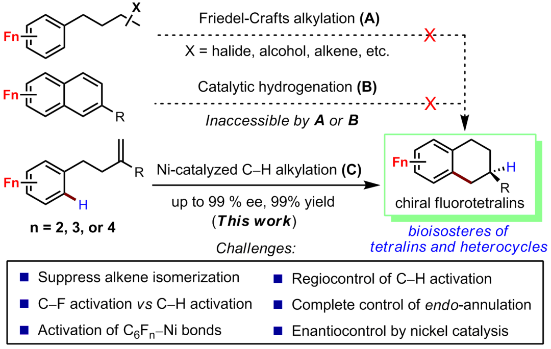 由于氟原子具有最強(qiáng)的電負(fù)性,可以調(diào)節(jié)分子的極性、構(gòu)象、pKa值以及代謝穩(wěn)定性等,向藥物分子的結(jié)構(gòu)中引入多氟芳烴往往可以調(diào)節(jié)其理化性質(zhì)及生物活性;在材料科學(xué)方面,通過控制多氟芳烴中的多個(gè)C-F鍵的方向可以得到高度極化的分子,作為介電材料在液晶中使用(圖1)。因此,多氟芳烴類化合物的構(gòu)建和官能團(tuán)化在有機(jī)合成化學(xué)中變得愈發(fā)重要。其中,多氟芳烴C-H鍵的直接官能團(tuán)化是最經(jīng)濟(jì)的方法。目前該領(lǐng)域僅有一些消旋反應(yīng)的例子被報(bào)道。近日,中國科學(xué)院上海有機(jī)化學(xué)研究所金屬有機(jī)化學(xué)國家重點(diǎn)實(shí)驗(yàn)室的施世良研究員課題組首次實(shí)現(xiàn)了多氟芳烴的催化不對(duì)稱C-H鍵官能團(tuán)化反應(yīng)。他們利用課題組發(fā)展的手性氮雜環(huán)卡賓(NHC)配體,實(shí)現(xiàn)了廉價(jià)金屬鎳催化的多氟芳烴的不對(duì)稱C-H烷基化反應(yīng),高效構(gòu)建了手性多氟四氫萘類化合物。該類化合物是四氫萘和多種雜環(huán)的生物等排體,被廣泛應(yīng)用于藥物設(shè)計(jì)中。相關(guān)成果發(fā)表于Angew. Chem. Int. Ed.(DOI: 10.1002/anie.201907387)。