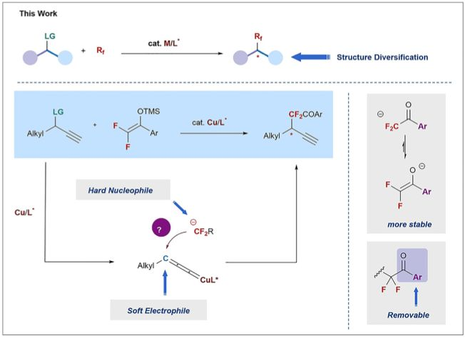 氟化合物,在近些年來的合成應(yīng)用上的重要性是很高的,尤其是在藥物和材料科學(xué)等領(lǐng)域中。所以,如何精確地使用分子工程的方式,進(jìn)行位點(diǎn)選擇性的氟代烷基化也就成為了一個重要的研究方向。在過去的十年中,由于科學(xué)家們的努力,氟代烷基化反應(yīng)也取得了令人矚目的成就。不過,不對稱催化氟代烷基化這個方向則仍是不發(fā)達(dá)的。這中間主要面臨的挑戰(zhàn)就是缺乏有效的不對稱催化方法來促進(jìn)氟代烷基化試劑的催化循環(huán),并要在同時間抑制其他副反應(yīng)的發(fā)生,這也導(dǎo)致了手性氟化藥物和農(nóng)用化學(xué)品的開發(fā)受到了阻礙。