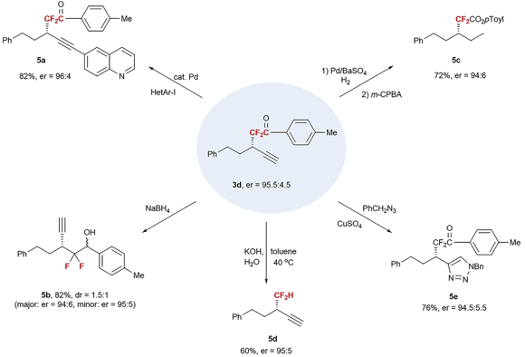 此外,他們也可以將所得的手性炔丙基α,α-二氟酮轉(zhuǎn)化為其他的對映體富集的炔丙基二氟甲基化產(chǎn)物。與此同時,也為了藥物化學(xué)和材料科學(xué)的手性二氟甲基化的化合物提供了一個良好的平臺,促使人們進(jìn)一步研究過渡金屬催化的不對稱氟烷基化反應(yīng)。