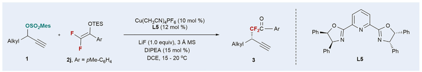 該研究使用了二氟烯氧基硅烷與二級炔丙基磺酸鹽作為底物,通過一價銅/PyBox配體的催化,即可在溫和的反應(yīng)條件下以高效,高對映選擇性和出色的官能團(tuán)耐受性實(shí)現(xiàn)反應(yīng)的進(jìn)行。
