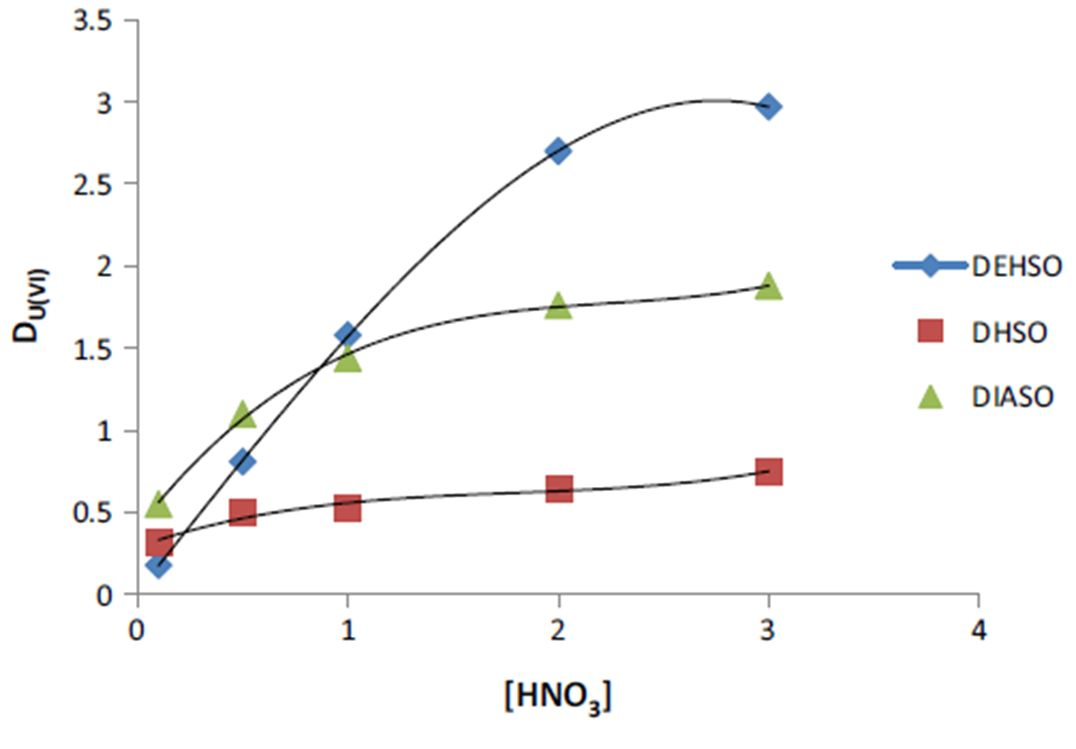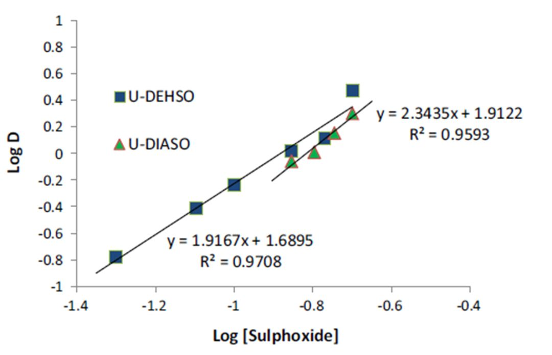 研究人員發現,三種配體對鈾酰離子的D值均隨酸度的增加而增大。并且1 M硝酸濃度以上時萃取順序為:DEHSO>DIASO>DHSO。DEHSO和DIASO都具有有支鏈的烷基鏈,說明具有支鏈取代基的亞砜的萃取效率高于直鏈型的萃取劑。此外,DEHSO相比于DIASO,其具有的更長烷基鏈使其表現出更好的萃取效果。研究人員推測這可能是由于DEHSO支鏈更長,使得其與本身及金屬-亞砜具有更多相互作用,并導致金屬-亞砜配合物在稀釋劑中的溶解度更高。