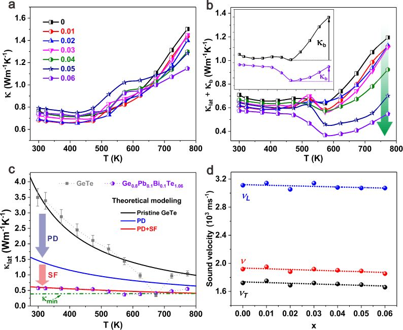 ▲第一作者:李培根,丁騰;通訊作者:張朝華 通訊單位:深圳大學論文DOI: https://doi.org/10.1002/adfm.201910059 全文速覽為了研究 Ge 空位對 GeTe 基合金的熱電輸運調控機理,我們通過 Pb-Bi 共同摻雜首先將 GeTe 的空穴濃度降低至最佳范圍,然后添加過量的 Te 來增加 Ge 空位,以研究 Ge 空位對熱電性能的調控機制。發現 GeTe 基合金中的 Ge 空位能促進能帶簡并、抑制雙極性輸運、降低晶格熱導率,在載流子濃度優化情況下對 GeTe 基合金熱電性能的提高產生積極影響。具體如下全文概括圖。 背景介紹熱電材料是一種實現熱能和電能相互轉換的功能材料,在環境污染和能源危機日益嚴重的今天,熱電材料的研究受到廣泛關注。一直以來,對熱電輸運調控機制的深入理解是提升熱電材料性能的必要前提。GeTe 是一種很有前途的中溫熱電材料,其優異的熱電性能引起了人們的極大興趣。 由于 Ge 空位的形成能低,導致純 GeTe 的載流子濃度高達 1021 cm-3,不利于提升 ZT 值。眾多研究者通過摻雜或合金化的方法來降低載流子濃度,并結合能帶工程和聲子工程的協同效應,得到了許多高熱電性能的 GeTe 基合金。因此,許多研究者認為 Ge 空位對提高 GeTe 基合金的 ZT 值具有負面影響,提出了各種抑制 Ge 空位的方法。但是 Ge 空位是否真的只產生消極作用呢?針對這個問題我們進行了更加細致的研究,發現事實并非如此。 研究出發點已有研究表明,Pb、Sb、Bi 等元素摻入 GeTe 能有效降低 Ge 空穴濃度,被廣泛應用于優化載流子濃度和降低晶格熱導率,以提高 GeTe 基合金的 ZT 值。因此我們選取了 Pb-Bi 二元素共同摻入 GeTe,把載流子濃度降到最佳范圍,在此基礎上,我們添加過量的 Te 來增加 Ge 空位,通過第一性原理計算、理論建模和實驗測試,發現當空穴載流子濃度降到最佳范圍時,Ge 空穴可以促進能帶簡并,從而獲得更高的電性能。此外,雙極性輸運通常在高溫區會激發,不利于實現高 ZT 值;然而,我們發現 Ge 空位可以增加帶隙,并使得 GeTe 由直接帶隙向間接帶隙轉變,這有利于抑制 GeTe 基合金中的雙極性輸運,從而在獲得高的電性能的同時能降低雙極性熱導率。這種 Ge 空位調控 GeTe 基合金熱電性能的機制是本文最大的亮點。 圖文解析A. Ge 空位促進能帶簡并通過實驗我們發現,隨著 Te 含量的增加,功率因子 PF 逐漸上升,在 300-773K 過量 Te(x=0.06)的平均功率因子相比于沒有過量 Te 的樣品提升了近一倍,這歸因于 Ge 空位促進了能帶簡并。為了更好地理解 Ge 空位對電性能的影響,我們進行了雙帶模型和三帶模型的理論模擬,如圖一所示,Ge 空位的增加使載流子濃度升高,但是遷移率卻變化不大,這有利于電性能的提升。同時我們進行了第一性原理計算,來驗證 Ge 空位促進能帶簡并的猜想。結合實驗數據和理論計算模擬發現,Ge 空位的增加確實對能帶收斂有積極作用。 ▲圖一:(a)塞貝克系數隨載流子濃度的變化圖;(b)載流子濃度和遷移率隨成分變化圖;(c)用三帶模型擬合的成分為 x=0 和 0.06 的塞貝克系數隨溫度的變化關系;(d)能帶結構隨 Ge 空位增加的結構變化示意圖。 B. Ge 空位對雙極性熱導和晶格熱導率的抑制通過第一性原理計算我們發現,Ge 空位引起了帶隙擴大,并且由直接帶隙向間接帶隙轉變,這對于抑制雙極性輸運和晶格熱導率具有重要意義,我們對樣品的熱性能進行了實驗分析,也恰恰印證了這一觀點。如圖二所示,晶格熱導率隨 Ge 空位的增加有減小的趨勢,特別是在高溫范圍內,由雙極性輸運引起的熱導率的增加效應逐漸減弱,說明能帶結構的變化確實對雙極性熱導率的抑制產生了積極作用;同時我們也對聲速也進行了分析,發現 Ge 空位濃度的增加導致的聲速降低也是晶格熱導率降低的一個原因。另外,我們基于晶格熱導率的理論模擬,也證明了 Ge 空位引發的堆垛層錯也極大的降低了晶格熱導率。 ▲圖二:(a)總熱導率隨溫度的變化圖;(b)晶格熱導率和雙極性熱導率隨溫度變化圖;(c)考慮點缺陷和堆垛層錯時晶格熱導率隨溫度變化關系;(d) 聲子速度隨成分的變化關系圖。 總結與展望研究發現,雖然 Ge 空位可以提高 GeTe 基合金的空穴載流子濃度,但通過 Pb 和 Bi 合金化可以消除高空穴濃度的負面影響。Ge 空穴可以促進能帶簡并、抑制雙極性輸運、Ge 空位引發的二維缺陷-層錯也有助于降低晶格熱導率,結合這些協同效應,GeTe 基合金的熱電性能得到較大提升。本工作加深了對 Ge 空位作用機理的理解,同時為其它熱電材料通過空位缺陷來提升性能也具有借鑒意義。 心得與體會在研究熱電材料的道路上,我們也走了很多彎路,導師建議我們要以發散的思維去看待問題,不能受到前人思想的禁錮,以辯證的眼光去看待實驗中的對與錯,你會有不一樣的發現和收獲。通過大量的文獻查閱,發現前人的工作普遍認為 Ge 空位對熱電性能是產生消極影響的,而我們站在對立面看問題,深入研究了 Ge 空位的作用機理及可能存在的積極效應。通過實驗測試、第一性原理計算和理論模擬的多方面角度來理解其本質原因,對 GeTe 材料中的 Ge 空位有了新的認識。我們的研究或許存在著一些不足,但是我們會不斷完善自己的認知,拓寬研究思維和渠道,不斷前進。 課題組介紹深圳大學材料學院新能源材料課題組研究主要集中在新型高性能熱電材料及器件的探索、制備、性能改善、二維材料、熱力學及第一原理計算等方面,形成了自己