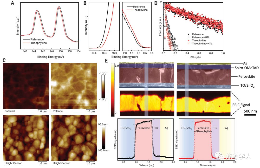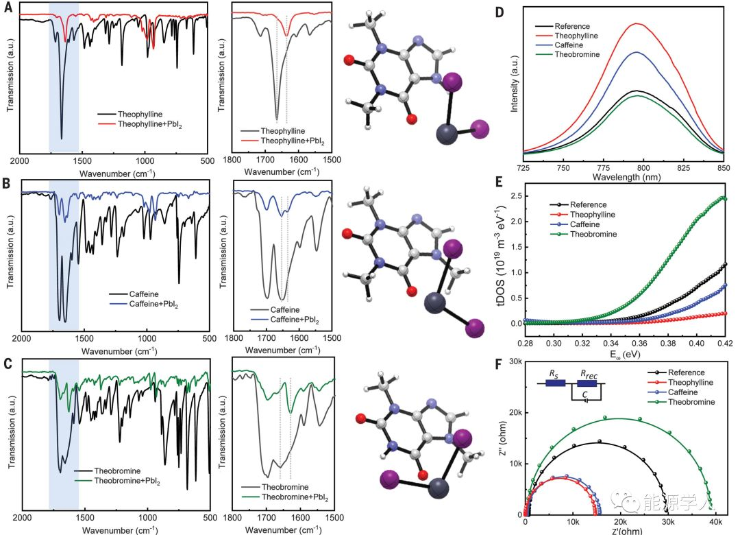圖4 通過(guò)茶堿處理增強(qiáng)了鈣鈦礦型太陽(yáng)能電池的光伏性能和長(zhǎng)期穩(wěn)定性。Constructive molecular configurations for surface-defect passivation of perovskite photovoltaics, Science 366 (6472), 1509-1513. DOI: 10.1126/science.aay9698