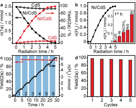 我們選用卞胺作為反應物(1a),分析評估了Ni/CdS催化劑的光催化脫氫偶聯活性(圖3)。與純CdS樣品相比,Ni/CdS表現出非常高的脫氫偶聯活性和選擇性。定量分析發現,催化劑的活性與反應過程中氫氣生成速率成正比,并且Ni納米簇體現出比其他助劑更優異的催化性能(圖3b)。此外,Ni/CdS催化劑具有非常好的循環穩定性(圖3c,d)。▲Figure 3. Performance of the Ni/CdS photocatalyst. (a, b) Evolution of reactant (1a) and products (2a and H2). Reaction conditions: 4 mg of CdS, 0.24 mM of Ni2+, 2 mmol of 1a under deaerated conditions in 10 mL DMF. The inset shows the H2 evolution within initial 1 h of CdS modified by different co-catalysts. (c, d) Stability test of the Ni/CdS photocatalyst. 2 mmol of 1a is added for each cycle. The blue bars mark the irradiation period.