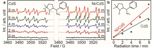 光催化有機胺脫氫偶聯主要包括3個過程:底物脫氫、偶聯形成亞胺、吸附氫脫附。因此,基于這幾個過程,我們對性能增強的原因進行了探討。首先,我們利用準原位順磁共振光譜(EPR)監測了光催化卞胺偶聯過程中碳自由基的變化(圖4)。在純CdS和Ni/CdS中,光照過程中均可以產生碳自由基,并且隨著光照時間的延長,碳自由基的濃度也會增加。雖然使用Ni/CdS產生的碳自由基濃度高于純CdS,但碳自由基增長速率遠遠低于前文中卞胺脫氫偶聯速率。這表明Ni納米簇對芐胺脫氫生成碳自由基的影響并非促進整體反應的主要因素。▲Figure 4. Promotional mechanism analysis. (a) In-situ ESR spectra of the fresh CdS and Ni/CdS (0.43 g·L-1) recorded in dark and under illumination in presence of benzylamine (0.1 M) and DMPO (0.1 M) in anaerobic DMF. (b) Evolution of integrated ESR signals of the C-centred radical as a function of irradiation time.