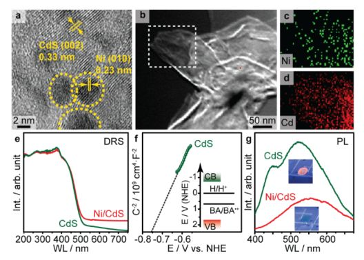 B. Ni納米簇修飾的超薄CdS納米片光催化劑(Ni/CdS)的制備和表征我們通過水熱法成功制備了厚度約為1.5 nm的超薄CdS納米片,接著通過原位光沉積的方式在CdS納米片表面沉積Ni納米簇。多種測試表明,Ni納米簇修飾并未改變CdS的微結構及能級結構,且能夠很大程度上降低CdS中光生載荷子的復合幾率(圖2)。▲Figure 2. Characterizations of photocatalysts. (a) HRTEM of the Ni/CdS photocatalyst. (b-d) HAADF and EDX elemental mapping images of the photocatalyst. The dashed square in (b) indicates the position of the EDX elemental mapping region. (e) UV-Vis DRS of CdS and Ni/CdS. (f) Mott-Schottky plot of ultrathin CdS NSs. The inset shows the estimated band structure of CdS and redox potential of amine. (g) PL spectra of CdS and Ni/CdS. The insets display the photographs of CdS (upper) and Ni/CdS (lower) under 420 nm illumination in glove-box.