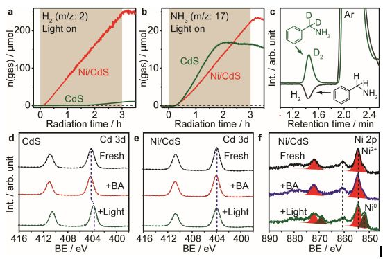 為了進一步探討Ni納米簇對加速卞胺脫氫偶聯的增強機理,我們采用原位質譜監測了光照過程中氣體的生成(氫氣及氨氣,圖5a, b)。實驗發現,在光照過程中,使用Ni/CdS光催化劑能夠促進氫氣和氨氣持續不斷地釋放,而使用純CdS則需要光照一段時間之后(氨氣結束釋放后)才有極少量氫氣析出。這表明鎳納米簇能夠極大的促進吸附氫以氫氣形式脫附,也是促進芐胺脫氫偶聯的真正原因。▲Figure 5. Promotional mechanism analysis. (a and b) Evolution of gaseous products (H2 and NH3) during amine dehydrogenation under visible light irradiation determined by in-situ mass spectrometry (420 nm LED, 75 mW·cm-2). (c) GC analysis of dehydrogenation product during photocatalytic amine coupling using normal and deuterated benzylamine. (d-f) High-resolution XPS of Cd 3d and Ni 2p of fresh photocatalyst, with dibenzylamine (BA) adsorbed, and exposed to irradiation (1 h), respectively.