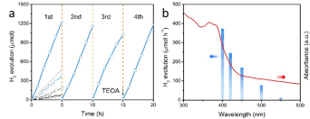 ▲Fig. 6. (a) Time course of H2 evolution for pristine C3N4 (black), etched C3N4 (gray), CRed-C3N4 (light gray), AT-C3N4 (light blue) and CRed-AT-C3N4 (blue), (b) Wavelength-dependent efficiency of H2 evolution over CRed-AT-C3N4 (left axis) equipped with a serials of cut-off filters, respectively, UV-vis light absorption spectrum of CRed-AT-C3N4 (right axis).