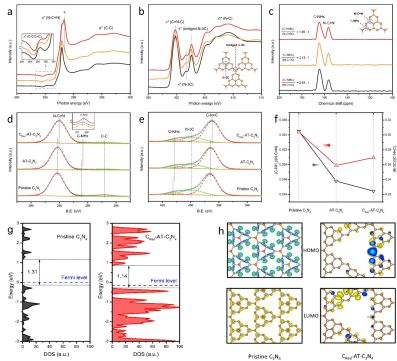 ▲Fig. 4. (a, b) XANES of C K-edge and N K-edge of pristine C3N4 (black), AT-C3N4 (orange) and CRed-AT-C3N4 (red). (c) Solid-state 13C MAS NMR spectra. (d, e) XPS C 1s and N 1s, (f) surface structural features according to the XPS peak area ratios. (g, h) Calculated density of states and spatial distributions of HOMO (blue) and LUMO (yellow).