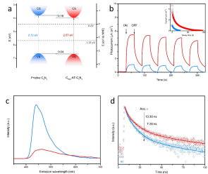 ▲Fig. 5. (a) Band structure diagrams of pristine C3N4 (blue) and CRed-AT-C3N4 (red). (b) Transient photocurrent. (c) Steady state and (d) transient state PL spectra.