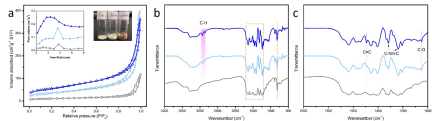 ▲Fig. 3. (a) N2 adsorption-desorption isotherms of pristine C3N4 (gray), AT-C3N4 (azure) and CRed-AT-C3N4 (blue). Inset is the pore size distribution. (b, c) FTIR spectra of pristine C3N4, AT-C3N4 and CRed-AT-C3N4.