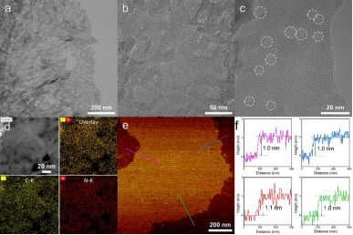 ▲Fig. 2. (a-c) TEM image of the CRed-AT-C3N4 and (d) elemental distribution mapping. (e, f) AFM image of the CRed-AT-C3N4 and height profiles along with the corresponding lines in (e).