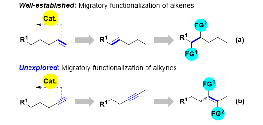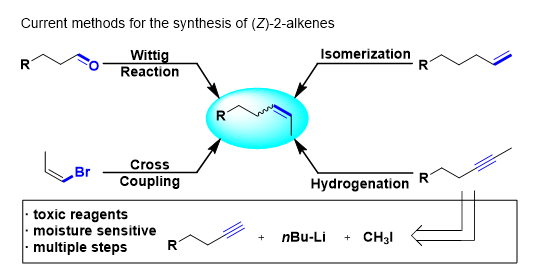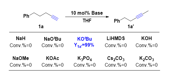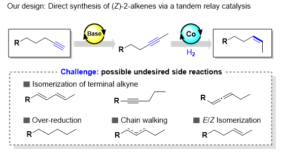 論文DOI:10.1002/anie.201916014 劉強課題組發(fā)展了一類新型的端炔遷移氫化反應,通過串聯(lián)堿促進的端炔至2-炔烴的異構(gòu)化反應以及卡賓-鈷催化的2-炔烴的半氫化反應,成功實現(xiàn)了(Z)-2-烯烴高選擇性合成。此外,通過反應條件的簡單調(diào)整還可以實現(xiàn)端炔至共軛(E)-烯烴的遷移氫化反應以及炔烴至端烯和內(nèi)烯的直接氫化反應。劉強課題組所發(fā)展的這一串聯(lián)催化反應體系能夠很好地控制反應的區(qū)域選擇性、化學選擇性以及立體選擇性,為發(fā)展其它類型的炔烴遷移官能團化反應提供了新思路。有機合成反應通常發(fā)生在底物分子中活性最高的反應位點。因此,實現(xiàn)底物分子中非反應活性位點的官能團化反應是非常具有挑戰(zhàn)性的。烯烴的遷移官能團化反應通過結(jié)合烯烴異構(gòu)化反應以及后續(xù)烯烴官能團化反應可以實現(xiàn)初始反應位點遠端的官能團化(圖1a)。鑒于其在合成方面的重要意義,目前這類反應轉(zhuǎn)化已經(jīng)得到了廣泛的研究和合成應用。與之相比,炔烴的遷移官能團化反應尚未見報道,盡管這類反應轉(zhuǎn)化可以實現(xiàn)由簡單易得的端炔至內(nèi)烯烴產(chǎn)物的高效合成(圖1b)。劉強課題組設想利用這類策略實現(xiàn)端炔的遷移氫化反應,從而高效、高選擇性地構(gòu)建內(nèi)烯烴產(chǎn)物。烯烴合成的一個關鍵問題是實現(xiàn)其立體選擇性控制。其中,實現(xiàn)2-烯烴制備的Z式選擇性控制仍然是一個難點。目前所發(fā)展的合成(Z)-2-烯烴常用的方法有:wittig反應,端烯異構(gòu)化反應,但是這兩類反應的Z/E選擇性并不高。此外,通過交叉偶聯(lián)反應制備(Z)-2-烯烴需要在底物中預先引入(Z)-烯烴單元。2-炔烴的半氫化反應是合成(Z)-2-烯烴一類有效的方法,然而2-炔烴的制備通常需要從端炔出發(fā)并使用非常敏感的丁基鋰試劑以及劇毒的碘甲烷,從而造成此類方法反應原子經(jīng)濟性不高,官能團兼容性具有一定的局限性(圖2)。堿促進的端炔異構(gòu)化反應是一個經(jīng)典的反應轉(zhuǎn)化,但是這一反應并沒有被廣泛應用于現(xiàn)代有機合成研究中。因此,課題開展之初,作者對堿催化的端炔異構(gòu)化反應進行了考察(圖3)。結(jié)果表明,僅有叔丁醇鉀(KOtBu)能夠高效實現(xiàn)端炔至2-炔烴的選擇性轉(zhuǎn)化。作者希望這一堿催化異構(gòu)化體系能夠與后續(xù)的內(nèi)炔氫化反應體系相兼容,從而實現(xiàn)串聯(lián)端炔異構(gòu)化/內(nèi)炔半氫化反應。▲圖3. 堿催化的端炔至2-炔烴的異構(gòu)化反應