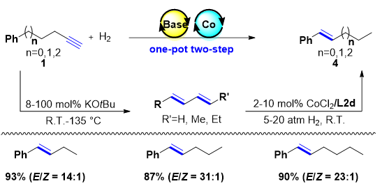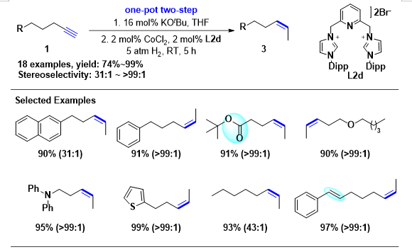 最近,劉強課題組發(fā)展了一類卡賓-鈷催化的酮和酯的氫化反應,其中,叔丁醇鉀(KOtBu)可以用作催化劑前體的活化試劑【Chem, 2019, 5, 1552; Chin. J. Chem. 2019, 37, 1125】。基于前期這些研究基礎,作者設想以簡單易得的端炔作為原料,發(fā)展串聯(lián)堿催化端炔異構(gòu)化/卡賓-鈷催化內(nèi)炔半氫化反應,實現(xiàn)(Z)-2-烯烴的高選擇性合成,而堿在其中起到兩個關鍵的作用(圖4)。實現(xiàn)串聯(lián)反應的化學選擇性、區(qū)域選擇性以及立體選擇性的協(xié)同控制是這一策略的難點所在,這就要求我們所發(fā)展的鈷催化氫化體系能夠高選擇性地氫化炔烴而不具備對烯烴氫化和異構(gòu)化反應的催化活性。作者結(jié)合堿(叔丁醇鉀)催化的端炔至2-炔烴的異構(gòu)化反應以及卡賓-鈷催化的內(nèi)炔半氫化反應,成功實現(xiàn)了端炔至(Z)-2-烯烴的遷移氫化反應(圖5)。該反應體系體現(xiàn)出了較高的官能團兼容性,可以兼容酯基、醚類、胺基、雜環(huán)、雙鍵等等。對于研究的所有底物均實現(xiàn)了很好的Z式選擇性控制,而且在反應體系中并沒有觀察到過還原以及異構(gòu)化等副反應的發(fā)生。此外,對反應條件進行簡單的調(diào)整還可以實現(xiàn)炔烴直接氫化反應,高選擇性地合成端烯烴以及(Z)-內(nèi)烯烴。▲圖5. 鈷催化的端炔至(Z)-2-烯烴選擇性合成