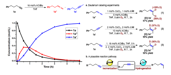 作者對于該串聯(lián)反應的機理進行了初步的研究(圖7)。首先,作者對堿催化的炔烴異構(gòu)化反應過程進行了動力學監(jiān)測(圖7,左側(cè))。結(jié)果表明,隨著端炔1a的消耗,聯(lián)烯1a′′在體系中逐漸累積后緩慢轉(zhuǎn)化至內(nèi)炔,內(nèi)炔1a′的濃度持續(xù)升高最終達到穩(wěn)定。這一結(jié)果說明聯(lián)烯很有可能是炔烴異構(gòu)化反應的一個關鍵中間體。此外,作者還進行了氘代實驗研究(圖7,右側(cè))。聯(lián)烯1a′′在D2氛圍下被還原為[D]-3a′,兩個氘原子分別處于雙鍵和端位甲基的位置(方程式1)。內(nèi)炔1a′在相同條件下得到[D]-3a′′,產(chǎn)物分子中烯烴的兩個氫被氘代(方程式2)。這些研究結(jié)果表明聯(lián)烯和內(nèi)炔均能夠直接氫化得到目標(Z)-2-烯烴,而無需經(jīng)過它們兩者之間的相互轉(zhuǎn)化。端炔1a通過遷移氫化生成氘代產(chǎn)物[D]-3a′′(方程式3)。這一結(jié)果表明該串聯(lián)反應經(jīng)過一個堿催化的端炔異構(gòu)化得到2-炔烴以及2-炔烴的半還原反應過程。總之,劉強課題組發(fā)展了一類新型的端炔遷移氫化反應,通過串聯(lián)堿促進的端炔至2-炔烴的異構(gòu)化反應以及卡賓-鈷催化的2-炔烴的半氫化反應,成功實現(xiàn)(Z)-2-烯烴高選擇性合成。此外,通過反應條件的簡單調(diào)整還可以實現(xiàn)端炔至共軛(E)-烯烴的遷移氫化反應以及炔烴至端烯和內(nèi)烯的直接氫化反應。劉強教授課題組成立于2015年,目前課題組成員有博士研究生7名。課題組圍繞均相催化的挑戰(zhàn)性問題,基于金屬有機化學發(fā)展新反應和催化劑,并注重利用物理有機化學手段進行深入的反應機理研究。通過對反應機理的認識進一步指導催化劑和反應的理性設計。主要研究方向為廉價金屬催化劑的設計、合成及其在綠色合成、生物質(zhì)轉(zhuǎn)化和高效氫能存儲系統(tǒng)中的應用。課題組網(wǎng)站:http://cbms.chem.tsinghua.edu.cn/liugroup/index.html