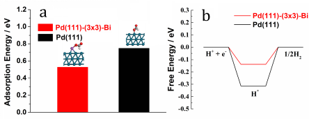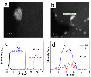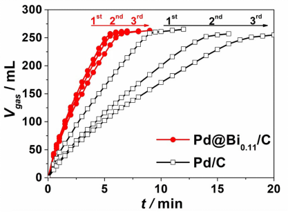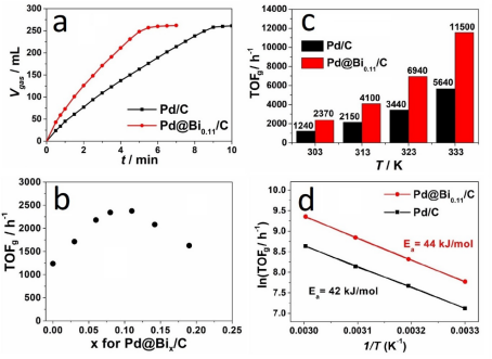 不難看出甲酸脫氫反應速率與甲酸根的吸附強度正相關,與H的吸附強度負相關。因此,需要增強Pd對甲酸根的吸附,減弱對H的吸附。另一方面,脫水反應路徑會生成強吸附物種CO,毒化催化劑表面,因此需要減弱催化劑對CO的吸附。已發表的理論工作表明,金屬材料對CO和H的吸附強度是正相關的。因此,設計原則仍然不失其簡單性。至此,我們得到甲酸制氫催化劑的設計指導原則:理想的甲酸制氫鈀基催化劑,相較于鈀,應具有更強的對甲酸根的吸附能力,更弱的對CO或H的吸附能力。查閱已經發表的電化學實驗和理論工作,Bi、Pb、Sb這一系列主族半金屬元素被選定為目標元素與Pd形成二元金屬催化劑。這一類元素對H、CO的吸附強度很弱,但是比Pd更親氧,更容易與甲酸根發生氧端吸附。另一方面,這一類元素與Pd接觸形成二元金屬體系后,會向Pd轉移電子,使得Pd費米能級附近的電子密度降低,進一步減弱Pd對CO、H物種的吸附強度。方程2表明存在一個最優的吸附原子覆蓋度,使產氫速率最大;而方程3表明在固定甲酸濃度下,存在最優的甲酸根濃度,使產氫速率最大。本工作將以Bi修飾的Pd作為模型催化劑說明催化劑設計原則的有效性。無需額外添加還原劑,將合成好的約2.3-nm Pd/C催化劑浸泡在Bi(NO3)3/HNO3溶液中,Bi就會隨機修飾在Pd顆粒的表面,這種合成方法十分成熟,最早可追溯到上世紀80年代相關的Pt上不可逆吸附Bi等原子。在Bi修飾之后,Pd金屬顆粒基本保持了2.5 nm的粒徑,未發生明顯團聚(Figure 1a,1b)。非原位的XPS測試表明,在空氣中,金屬顆粒表面的金屬原子都會被氧氣氧化。Bi幾乎完全以氧化態存在,說明Bi主要存在于可以直接與空氣接觸的金屬顆粒表層(Figure 1c,1d)。原位XAFS表明金屬顆粒表面的Pd在甲酸脫氫反應過程中會被還原,但無論在制氫條件下還是空氣中,Pd-Pd鍵的鍵長均與Pd單質相同,表明Bi并沒有破壞Pd的fcc晶體結構,沒有形成Pd-Bi合金結構(Figure 1e,1f)。這種Bi隨機點綴在Pd顆粒表面的結構可以直接在HAADF-STEM照片和EDS圖譜中看出(Figure 2)。圖1.Pd/C和Pd@Bi0.11/C催化劑的形貌結構和電子特性表征圖2.Pd@Bi0.11/C的高分辨STEM和能譜表征實驗表明,Bi修飾后的Pd/C催化劑對甲酸制氫反應表現出更高的催化活性(Figure 3a),催化活性隨Bi的覆蓋度存在極大值,極大值在Pd:Bi總原子比為9:1時取到(Figure 3b)。在優化的甲酸-甲酸根溶液中,303 K下Pd@Bi0.11/C上產氫的TOF值可達4350 h--1。值得注意,Bi對催化活性的提升效應隨溫度變化不大,修飾前后催化劑的表觀活化能幾乎不變(Figure 3c, 3d),這提醒我們表觀活化能往往無法反映催化劑的本征活性。甲酸制氫循環性測試表明Bi修飾后的催化劑具有更高的反應穩定性,這很可能與其減慢了CO在催化劑表面的累積速度有關(Figure 4)。圖4.Pd@Bi0.11/C和Pd/C催化劑甲酸制氫循環性能對照DFT計算結果表明,在Bi修飾在Pd表面后,甲酸根傾向于吸附在略帶正電的Bi原子上,與純Pd相比吸附能增強。值得注意,兩種表面上,甲酸根的吸附能都很弱(能量越負,吸附越強),這與實驗事實以及和我們上述推導的假設相符(Figure 5a)。另一方面,在Bi修飾在Pd表面后,H對金屬表面的結合能減弱(Figure 5b)。總之,DFT計算表明Bi修飾后,催化劑對甲酸根的吸附能力變強,對H的吸附能力變弱。另一方面,我們直接應用原位ATR-IR技術監測CO在反應過程中在催化劑表面的累積速率(Figure 6)。結果表明,Bi修飾后,CO在催化劑上的累積速率顯著下降,表明催化劑獲得了更高的反應選擇性和抗CO中毒能力。圖5. DFT計算得到的模型表面HCOOM*吸附能和H* 結合能圖。圖6.甲酸制氫反應過程中原位ATR-IR光譜跟蹤催化劑表面CO累積上述工作基于甲酸脫氫-產氫機制的動力學分析,提出了Pd基-二元催化劑的設計指導原則,即表面對甲酸根吸附增強但對H、CO吸附減弱的催化劑可促進甲酸分解產氫。據此,在自制Pd/C的Pd表面自發沉積Bi原子,獲得了具有優異性能的Pd@Bi/C催化劑。通過各種物理表征驗證其結構,通過DFT計算和原位紅外光譜表征進一步驗證上述指導原則的合理性。值得一提的是,該工作從反應機理、反應動力學分析的角度出發,為快速設計、篩選本證活性和穩定性同步提升的甲酸制氫催化劑提供了一種新思路。上述催化劑設計指導原則具有拓展性,不僅適用于鈀表面修飾異種金屬原子,也可適用于其它Pd基二元合金催化劑的理性合成。